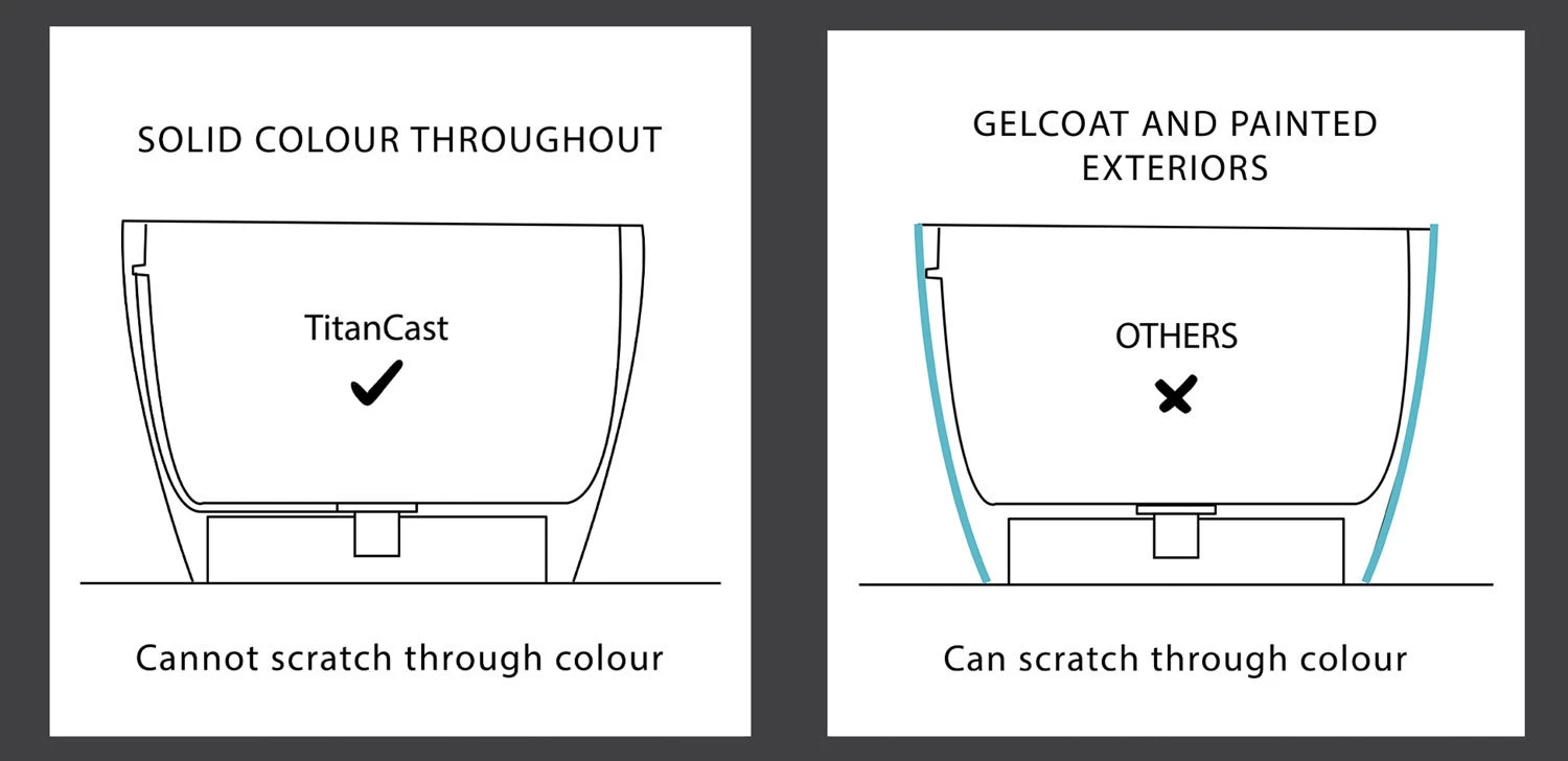 TitanCast Solid Surface Baths are unparalled in quality, performance, durability and beauty. They are non-porous, hygienic, stain and chemical resistant and a repairable material. The TitanCast baths are solid throughout, scratches can be buffed out during the bath’s lifetime, furthermore the white is crafted to match high quality ceramics creating a cohesive look in our bathroom.
